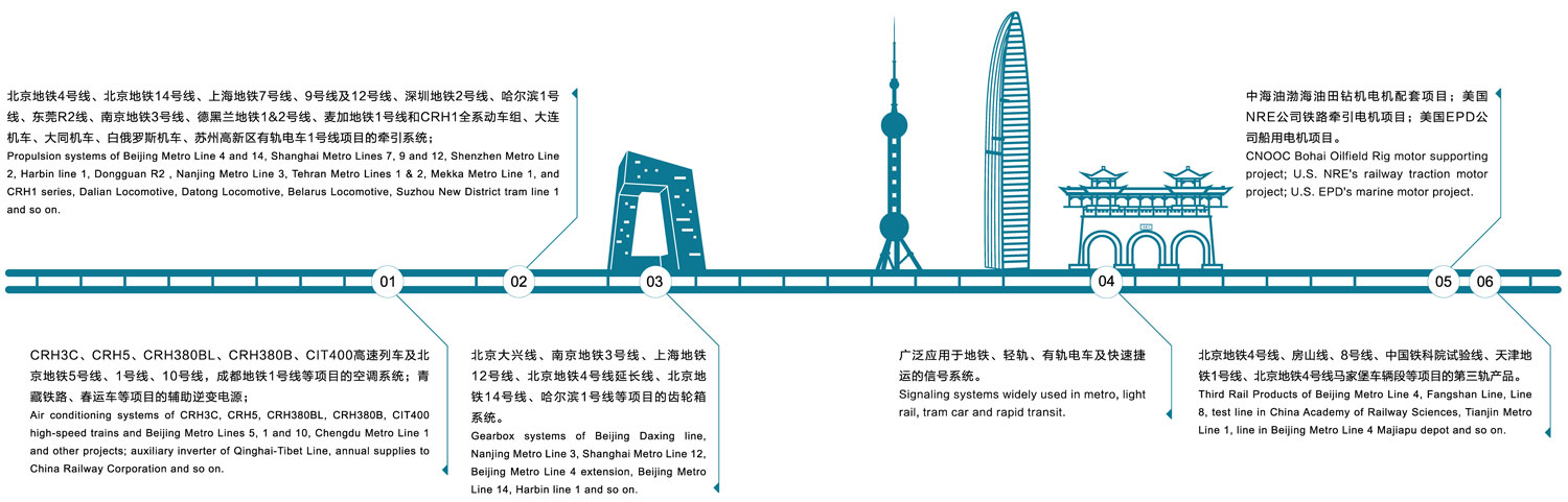 02.北京、上海、广州、深圳、天津、成都、哈尔滨、南京、乌鲁木齐、兰州、厦门、东莞、佛山等20个国内城市,和德黑兰、麦加、曼谷等海外城市的地铁,以及CRH1全系列动车组,大连、大同、白俄罗斯机车,南京、苏州有轨电车,上海自动捷运系统,芜湖单轨项目的车辆牵引系统;